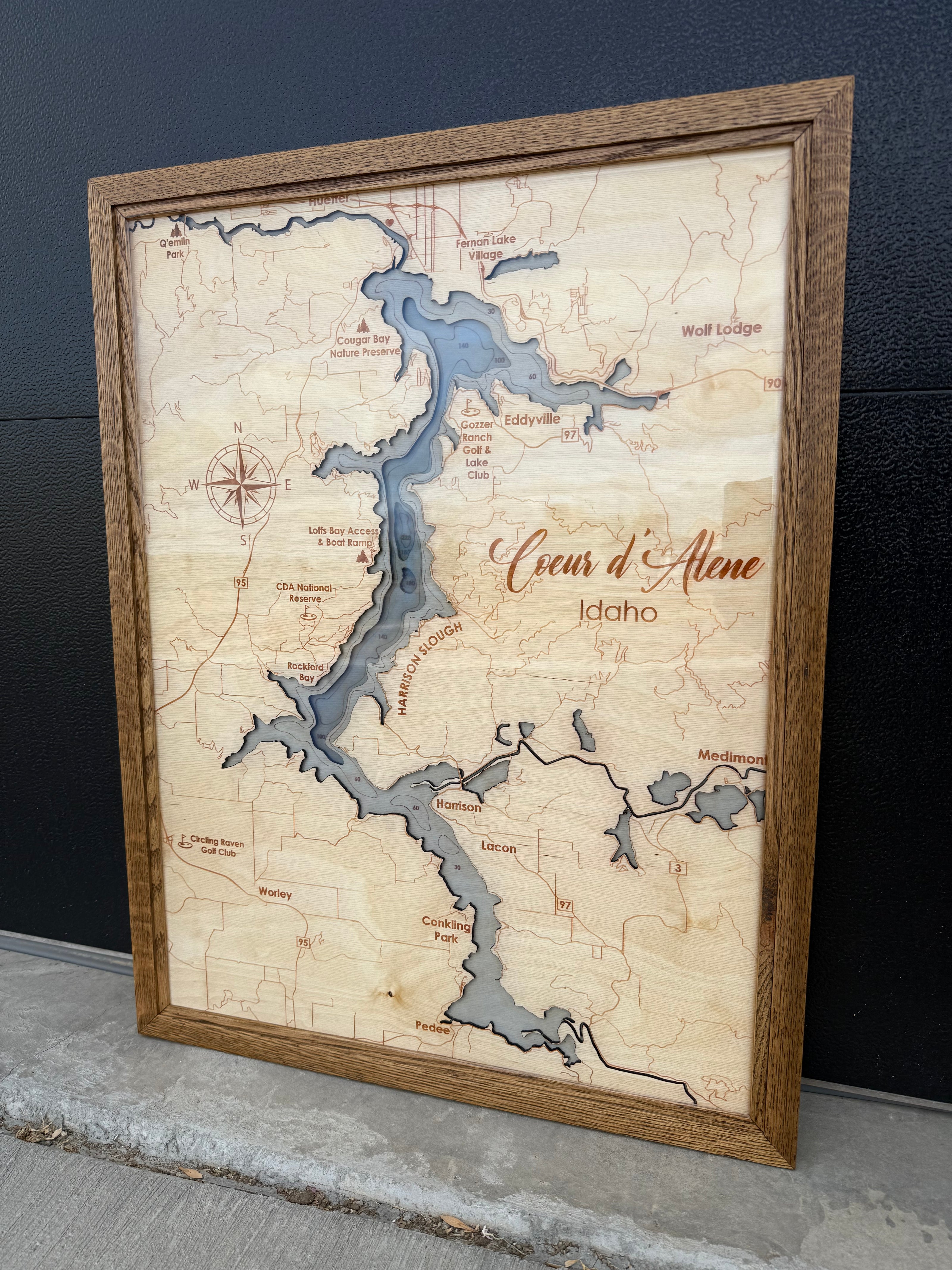 Every map is made by hand right here in Montana - layered, engraved, and framed using quality woods and finishes. From Oak, White Oak, and Walnut to deep-pour blue epoxy inlay that brings the water depth to life with a epoxy finish, each piece is designed to last a lifetime. Prices range from $650 - $1,400, based on size and materials. A $75 non-refundable design fee is required to begin each custom project, which includes your personalized lake design, layout, and approval before production. This also holds your space in the queue.